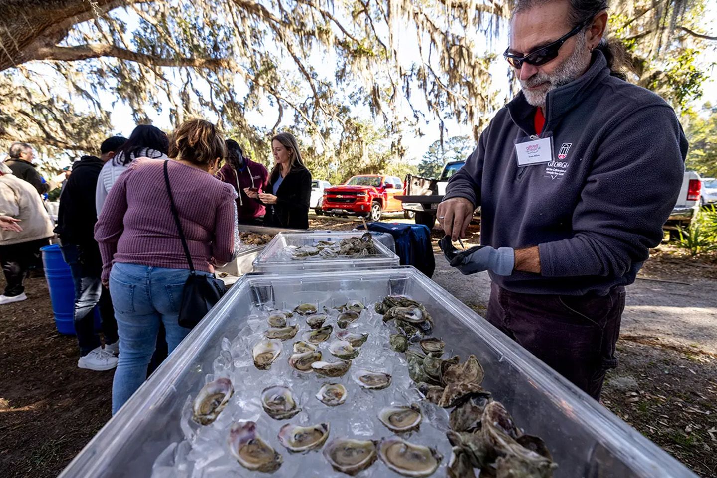 Oysters begin life as tiny larvae, drifting in the water column until they find a hard surface on which to settle and grow. As adults, they create underwater reef communities that attract fish, crabs, and other marine life, forming the foundation of a thriving ecosystem. A similar oyster community is taking shape on land, driven by the rise of sustainable oyster aquaculture in Georgia. UGA researchers, shellfish farmers, restaurants, nonprofits, and state agencies are teaming up to grow Georgia’s coastal economy with oysters at the center.
